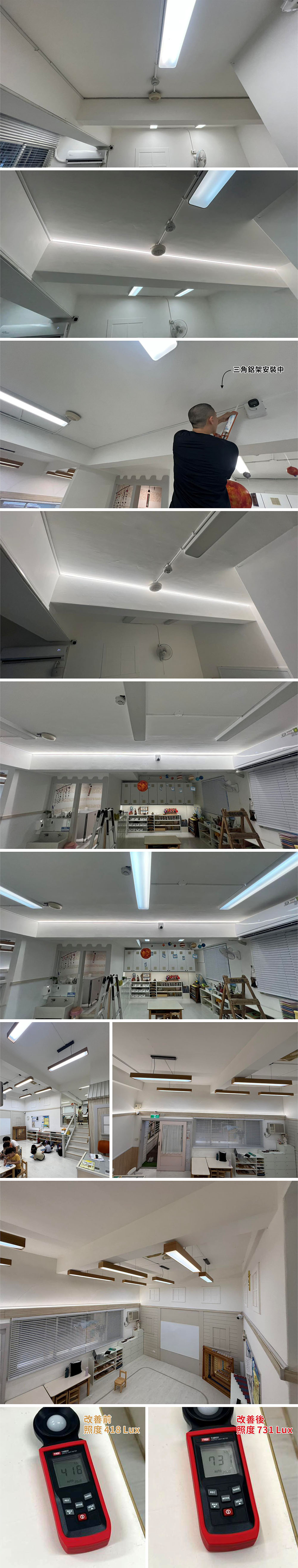 幼兒園因燈光照度不足,經過現場勘查後進而改善,照度由原本的 418Lux 增加到 720Lux 燈光充足明亮,我們是用三角鋁條 LED 燈+智能控制器,不但可單獨開關及調亮度,也不影響原有的空間及環境 美觀,老師及孩子們都說好亮喔! 歡迎來電洽詢相關資訊! 案場地點: 內湖區 #燈具安裝 #LED線型燈具 #LED調光控制